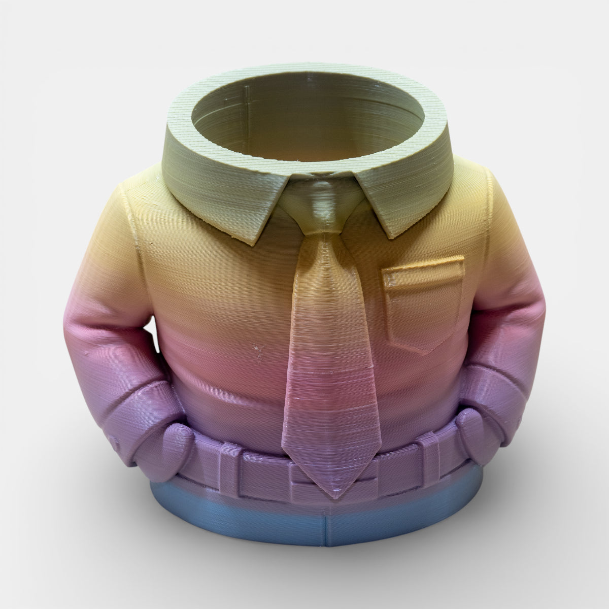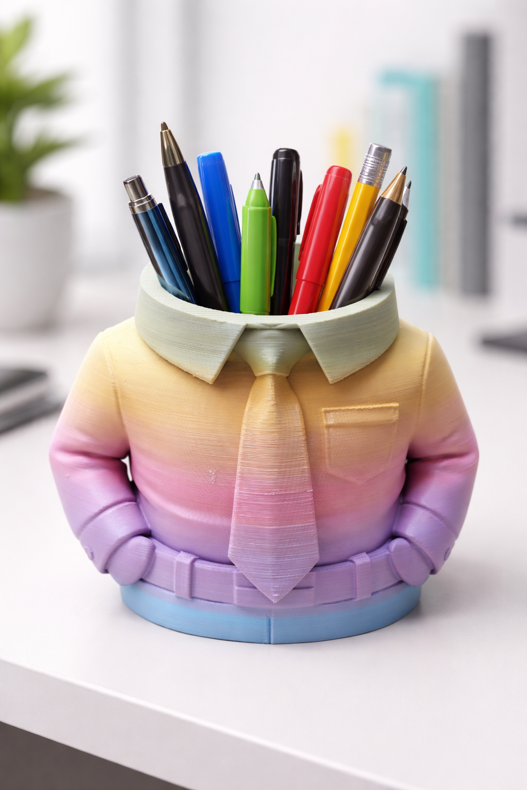 Gömlek ve kravat formundaki bu masaüstü kalemlik; ofis masasına karakter kazandırmak isteyenler için tasarlandı. Kalem, marker ve küçük ofis gereçlerini düzenli şekilde saklamaya yardımcı olur.