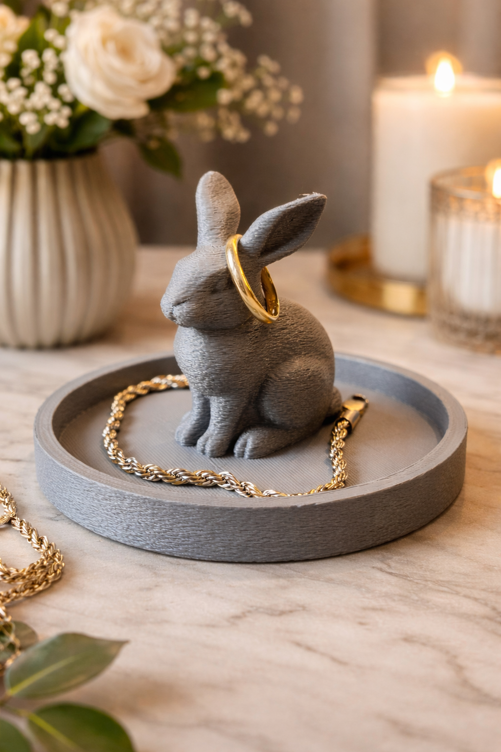 Bu tavşan figürlü takı tutucu, yüzük ve küçük takıları tek bir yerde toplamak için tasarlanmış minimal ve dekoratif bir masa üstü organizeridir. Ortadaki tavşan formu ürüne karakter kazandırırken, çevresindeki dairesel tepsi yüzük, küpe ve benzeri küçük aksesuarlar için pratik bir alan sunar.