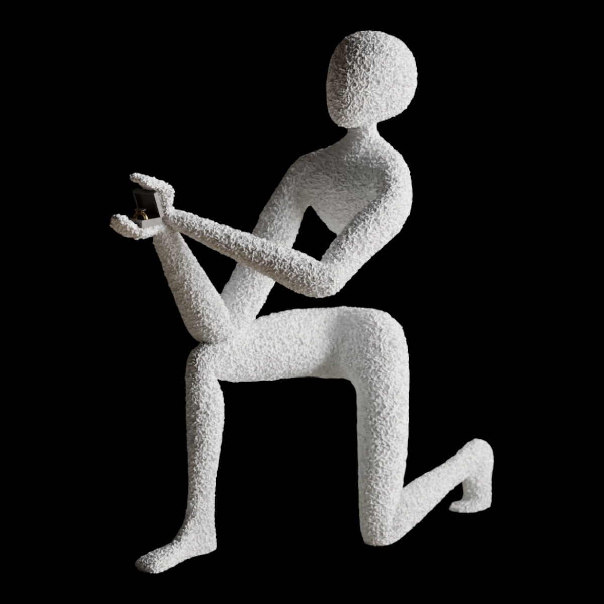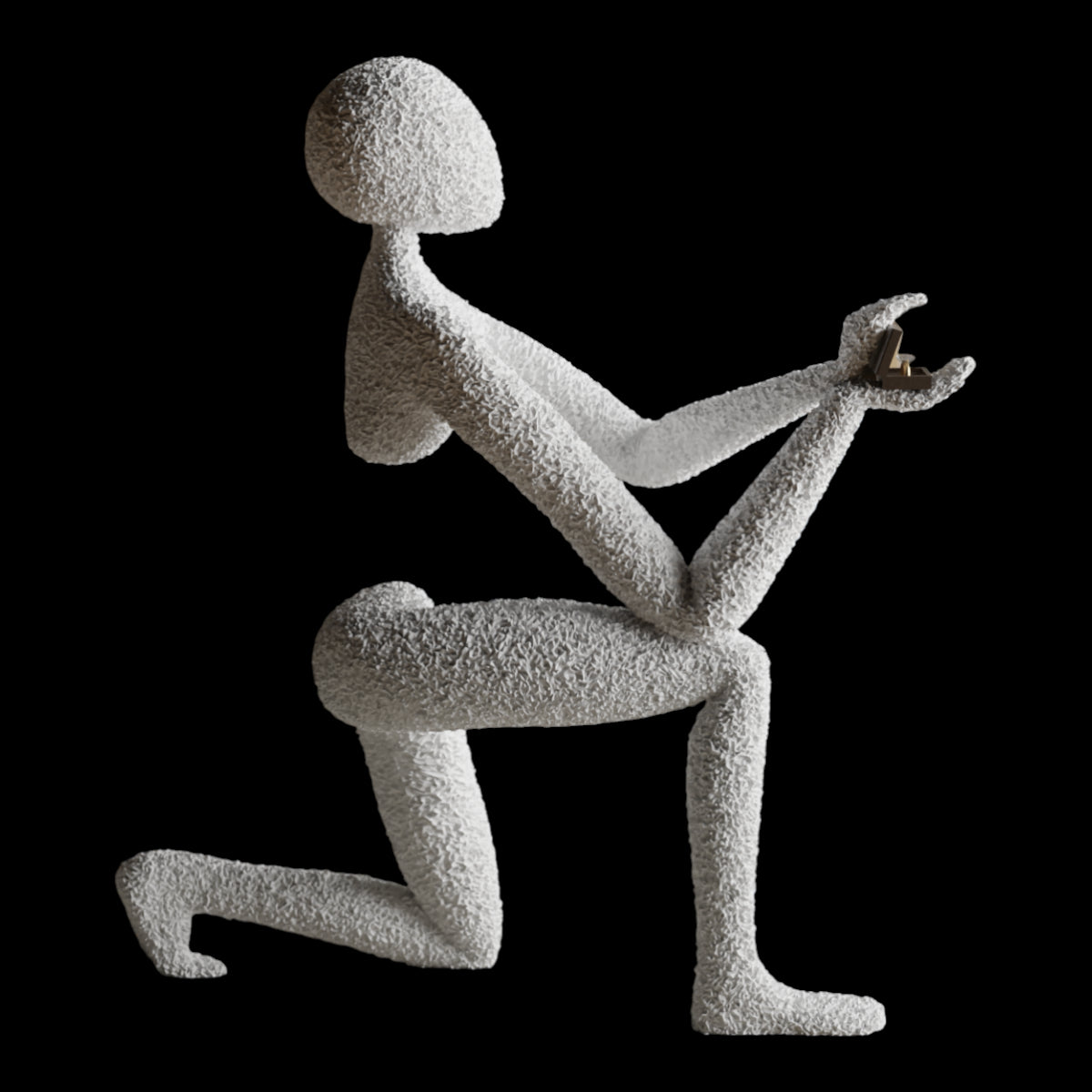 "NObody's Proposal: A Symbol of Timeless Love" adlı minimalist heykelle sevginin ve bağlılığın özünü kucaklayın; bu heykel, zaman içinde donmuş bir jestin derin güzelliğini yakalıyor. Zarif bir şekilde diz çökmüş, yüzü görünmeyen bu figür, sonsuz bağlılığın sembolü olarak bir yüzük kutusu sunuyor.