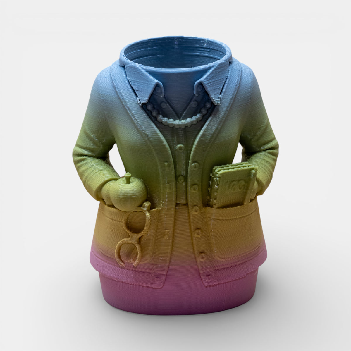 Ceket, gömlek ve aksesuar detaylarıyla tasarlanan öğretmen figürlü kalemlik; kalem, marker ve küçük ofis eşyalarını düzenlemek için idealdir. Akademik duruşu ve klasik tarzı sayesinde çalışma masasına karakter katar.