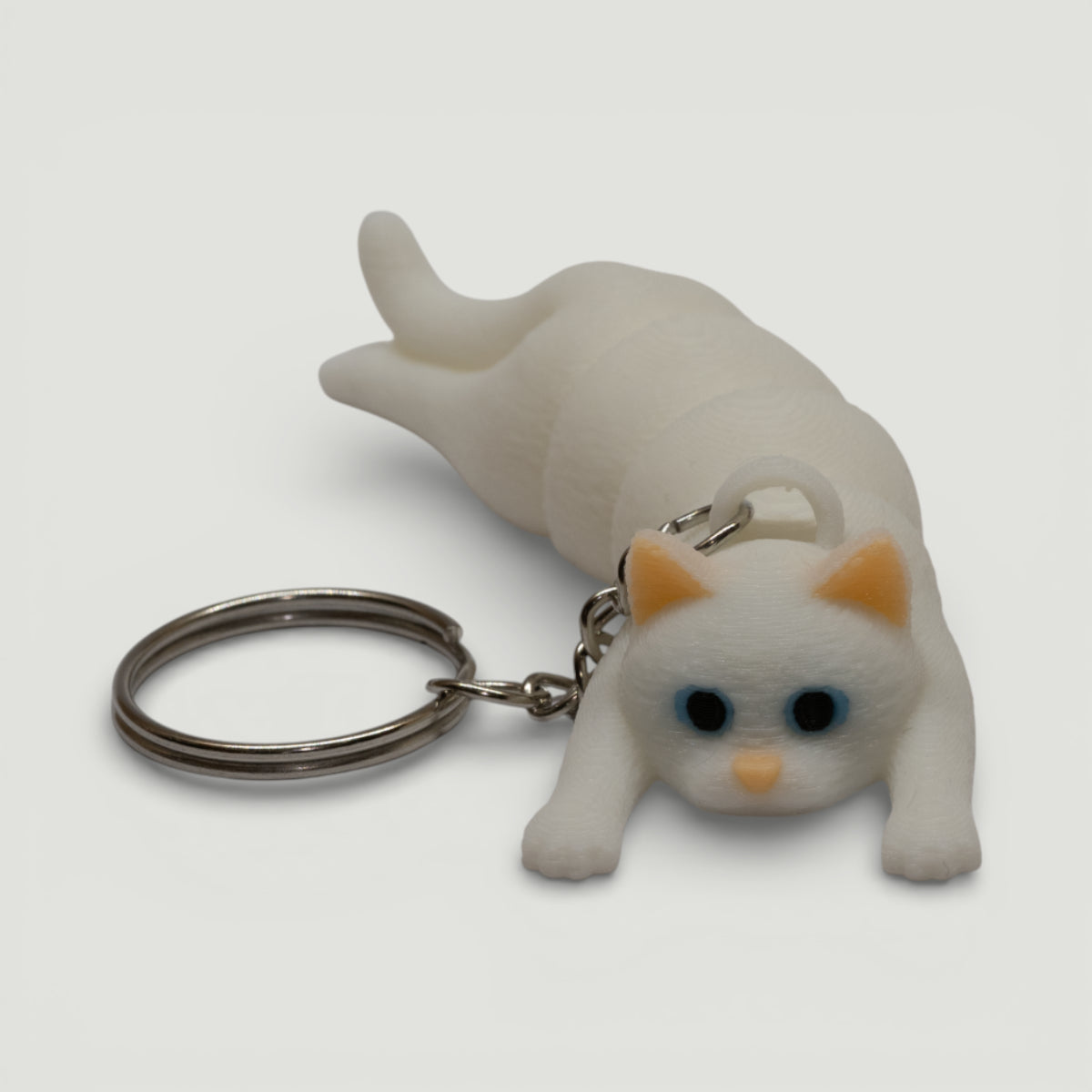 Bu kedi anahtarlık, çok parçalı eklemli yapısı sayesinde gerçek bir hareket hissi verir. Gövde segmentlerden oluşur; her eklem bağımsız hareket eder. Sonuç: elde oynadıkça kıvrılan, poz veren, yaşayan bir figür.